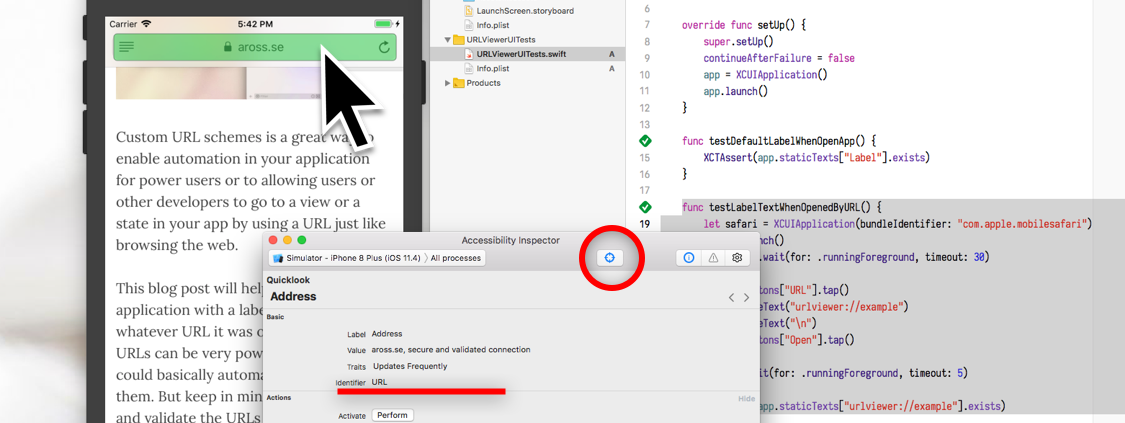 But we would also like to test that the application changes the URL to the one that it was opened with. We do know that we can use Safari in the simulator simulate that the application was opened using an URL. We can automate other applications in the UI tests as well and use Accessibility Inspector to find the identifiers for the components we would like to tap or interact with.